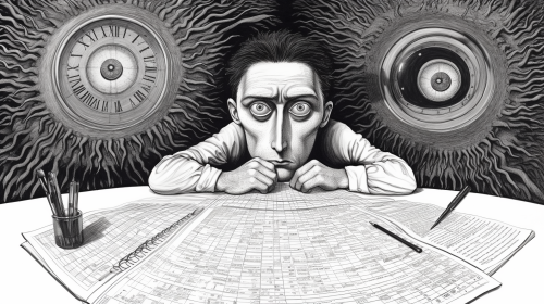 Black and white ink drawing of a human eye with long messy eyelashes, a finger is poking the eye. The drawing features simple line work on a white background, with black line work only and a small red circle behind the eye, in a simple linocut style, junji ito. --ar 9:16 --v 6.1