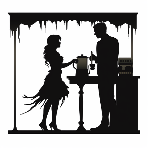 silhouette of male and female zombies, comic silhouette heading to a big coffee machine, funny, vector graphic style, no background