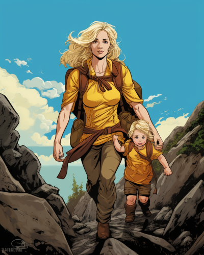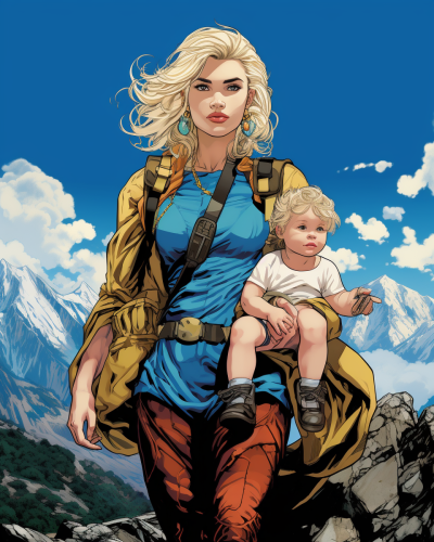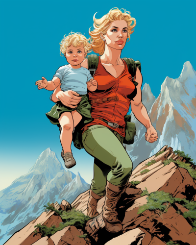 heroic blonde mother carrying 3 year old girl and a small baby up a mountain, comic book style, --ar 8:10