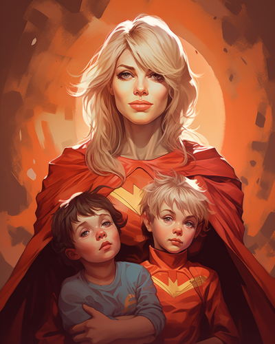 heroic blonde mother with her two small children, heroic pose, comic book style, --ar 8:10