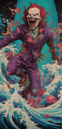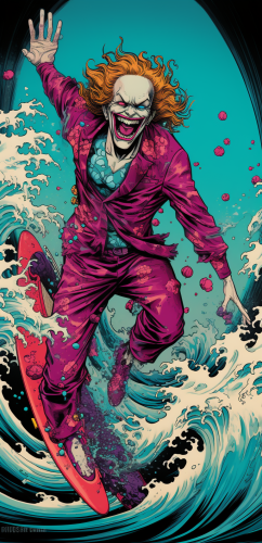 Generate an image of the Joker standing on two legs on the back of a shark and surfing on it,in the style of vibrant comics, asian-inspired, light maroon and teal, japanese prints, intense close-ups, twisted characters, trillwave --ar 31:64 --v 5.2