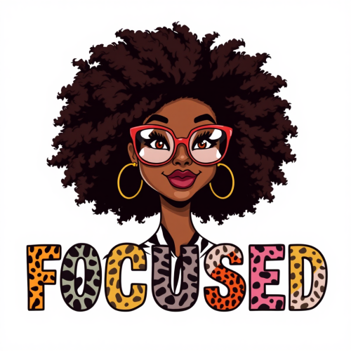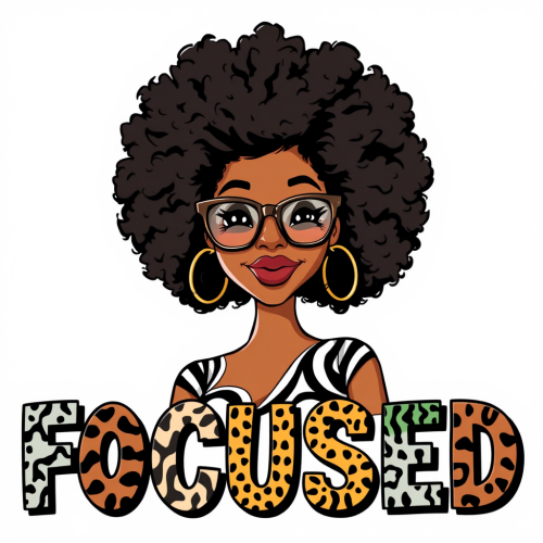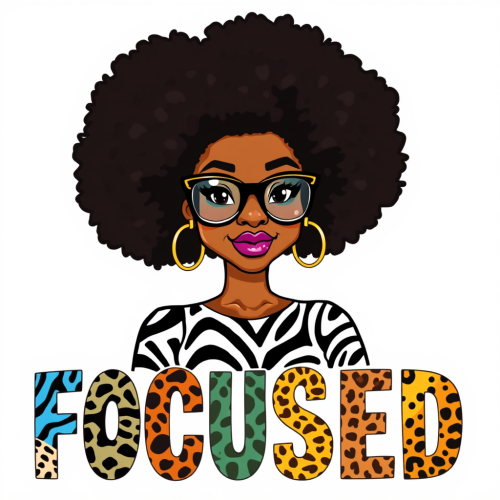 An illustration of a confident American woman with a voluminous afro, wearing oversized glasses and large hoop earrings. She sports a zebra-patterned top. Below her, the word FOCUSED is displayed in bold, colorful letters, each letter featuring different animal prints and patterns. The background is white, emphasizing the vibrant colors of the text and the character.