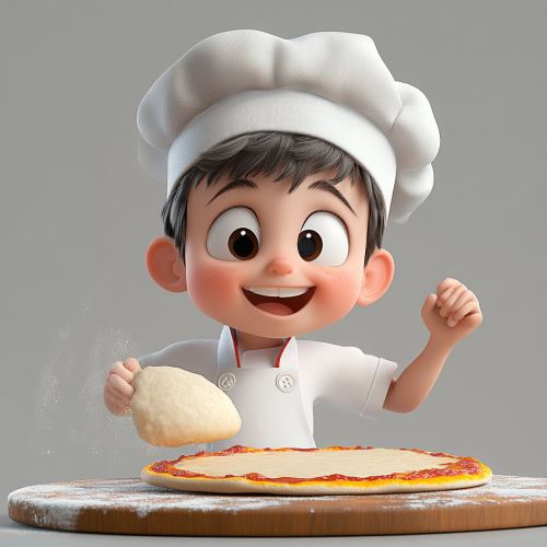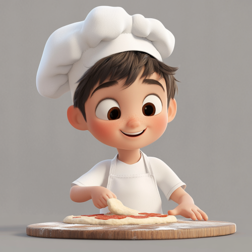 little boy, 5 years old, chef hat, making pizza,throwing up dough, pixar style, animation, cartoon, 3d, plain background, having fun, cute, grey background