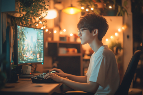 A young Asian man is sitting at his desk, wearing glasses and a white T-shirt with black shorts. He's playing computer games on the keyboard in front of him. The room has lights that cast soft shadows from above onto their faces. There was an LED light hanging over the man, illuminating him from behind. In the background, there are wooden furniture and plants, creating a comfortable atmosphere. Photographed in the style of Sony A7R IV, 35mm f/2 lens. realities --v 6.1 --ar 128:85