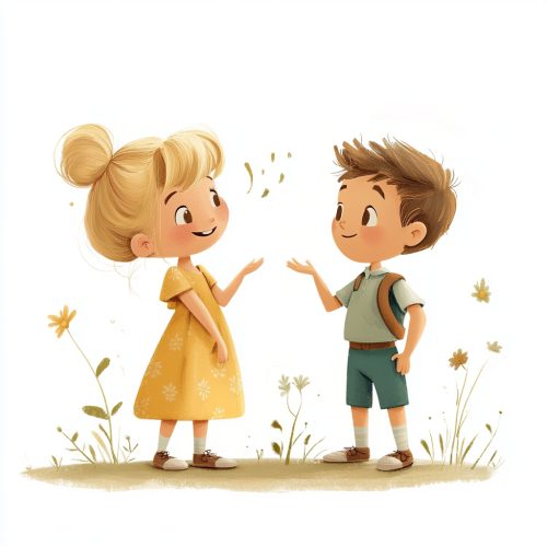 cute girl (with blond hair bun, yellow dress, brown shoes, smiling, 2 arms with each 5 fingers) and a little boy (with brown hair, a blue short pants, a green dottet shirt, brown white shoes, 2 arms with each 5 fingers) talking to the wind, wind, trees, some flowers, cartoony character, organic forms, evening, airy pastel color palette, spring colours, soft watercolour by liniers, white background,. 3d