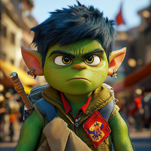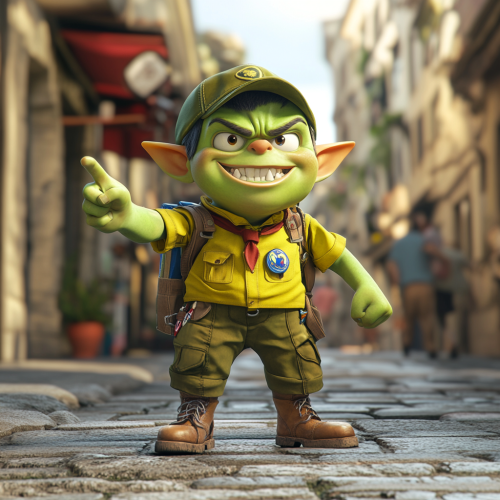 green orc child dressed as a boy scout helping people on the street pointing forward, looking forward, pixar theme, 3d, render, 3d pixar, funny texture, beautiful colors, hue saturation, many colors, funny scene, zoom face,