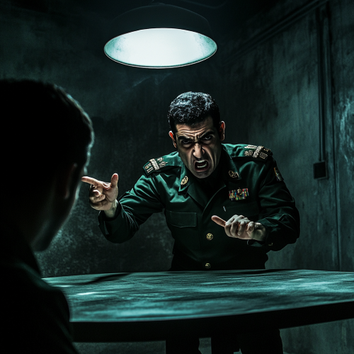 A dark, tense interrogation room in Iran, with a shadowy anonymous figure sitting at the table, illuminated by a single, harsh overhead light. An IRGC officer in military uniform is aggressively leaning forward, shouting in the face of the seated person, with one hand slamming down on the table, the other pointing at them. The officer’s expression is furious, eyes wide with intensity, creating a terrifying and intimidating presence. The room is stark, cold, and minimalist, with concrete walls. High contrast lighting, cinematic tension, and a moody atmosphere, capturing the drama and fear of the moment