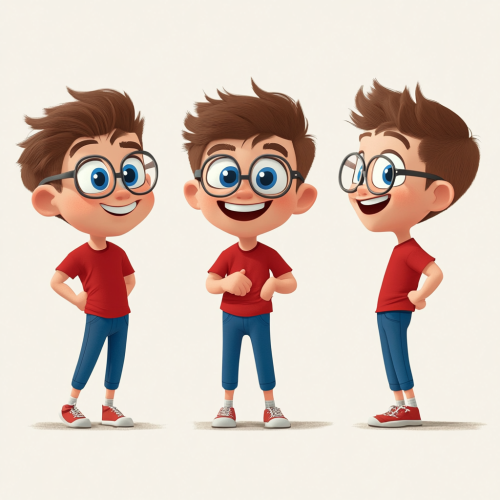 A small cartoon character that will serve as the avatar of the main character. I would like the character to appear in 3 different positions in one image: Jumping and laughing Thinking Solving math problems Worried and pondering. Distinctive features: a boy around 15 years old, with brown hair, large blue eyes, wearing glasses, smiling, in a red t-shirt and blue pants - a math student. The character should be caricatured, with a big head and small legs, in a Pixar-style