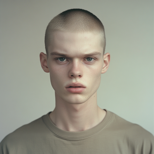 a pale young man with close cropped hair wearing a t-shirt facing forward with downcast eyes and with mouth slightly open against a plain background and in soft natural light