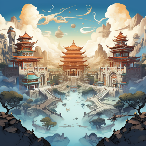 cartoon art in the style of Avatar: The Last Airbender universe, stylized drawing of a fantasy city, jung;e background is full of Avatar: The Last Airbender imagery artistic background, karate, martial arts, asian art, action, Avatar, cartoon, fantasy castle