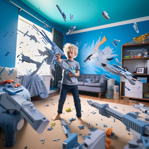 an 8 year old blonde boy in his room playing with a 3d printer. His room is decorated with rockets and ninjas. Light blue paint on the walls