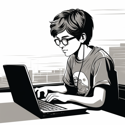black and white thick line logo showing 12 year old boy wearing white polo programming a computer