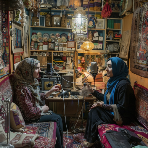 two iranian women with hijab, hosting a podcast in a room that is filled with Iranian memorabilia and trinkets