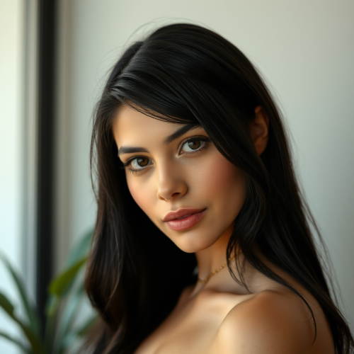 A highly realistic photograph of a 28-year-old woman with black hair, medium build, upper body shown from head to just below the chest, making direct eye contact with the camera. The image features natural skin textures, soft lighting that enhances natural curves, detailed hair strands, Canon EOS R5, 85mm lens, f/1.8 aperture --style raw