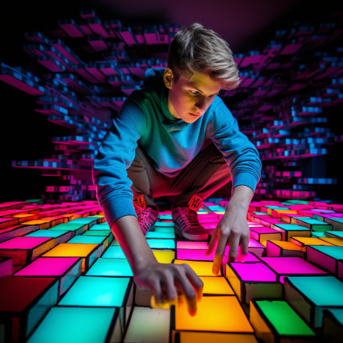 13 year old boy playing tetris on a snes in the style of Anthony Burrill neon colours