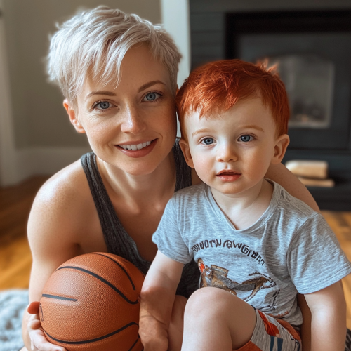 a mom who is 28 years old with a short pixie haircut that is silver in color holding her one year old boy with big blue eyes and red hair. He also has basketball shorts and a t shirt on with socks on his feet