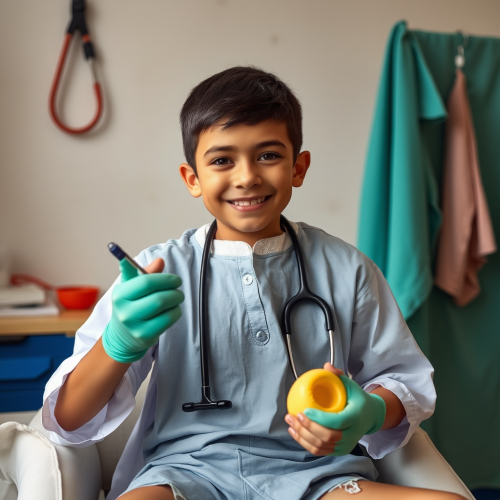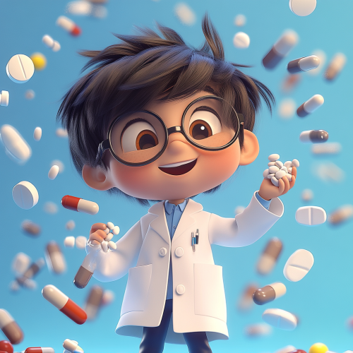 little boy, 5 years old, pharmacist, white coat, holding medicine pills, surrounded with medicine and pills, blue background, pixar style, animation, cartoon, 3d