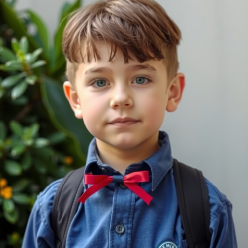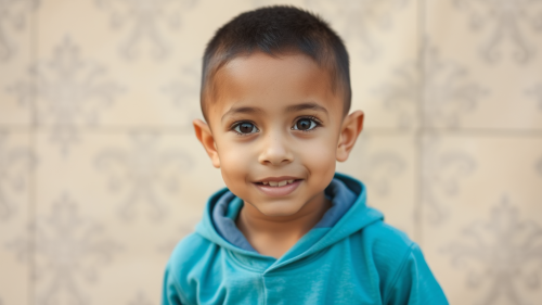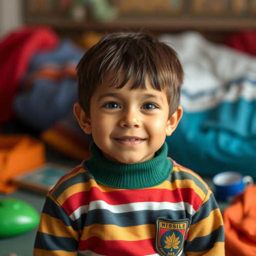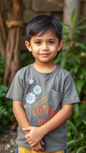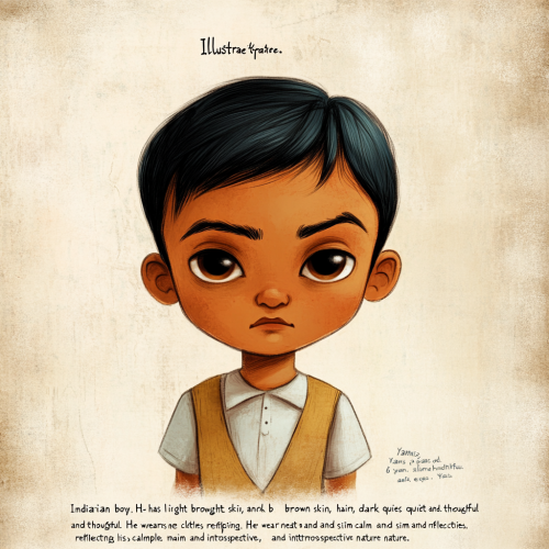 "Illustrate Yanis, a 6-year-old Indian boy. He has light brown skin, straight black hair, and dark eyes. Yanis is slim, quiet, and thoughtful. He wears neat and simple clothes, reflecting his calm and introspective nature."