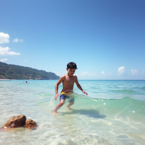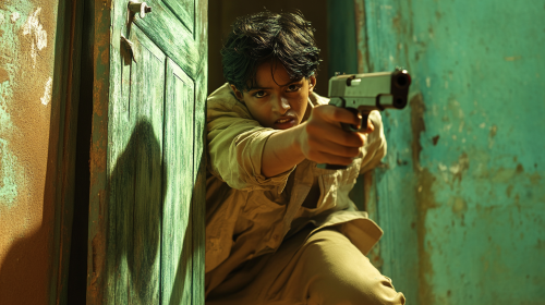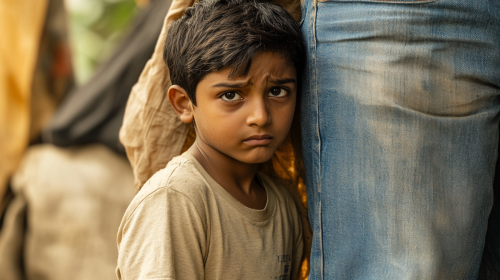 generate a long shot image of a 13 years old south indian boy standing and hiding slightly behind a person, the boy is wearing denim pant and beige color t shirt, slight fear visible in his face, --ar 16:9