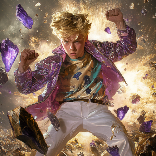superhero, 13 year old Kentucky male, blonde, body made of rock, Rockabilly style outfit, marching band coat, amethyst crystals growing out of body, super strong, ynamic fighting pose, environment with energy blasts shooting at him, explosions, photoreal comic cover