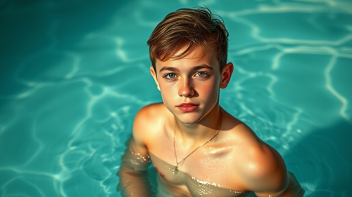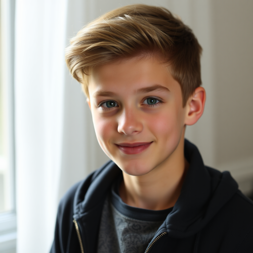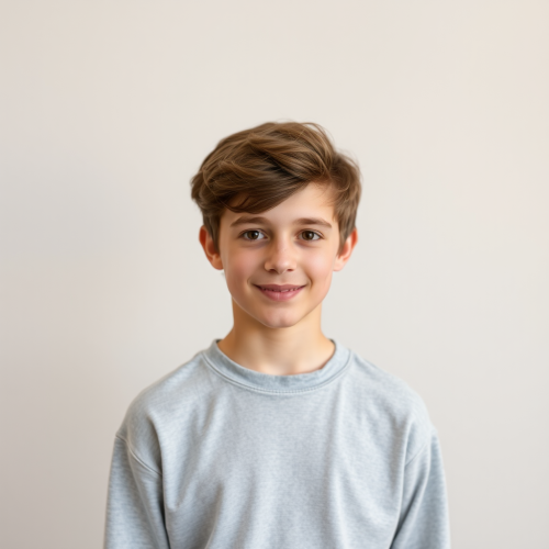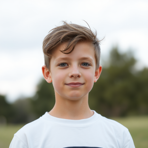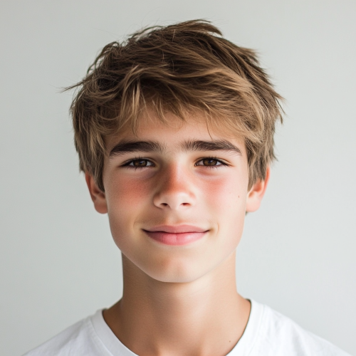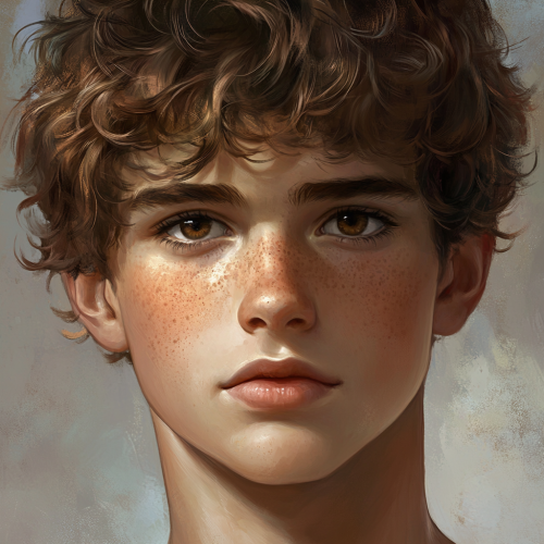 art for a YA protagonist in a novel. Boy, 14 years old. He has a fair complexion and a series of freckles that concentrate around his nose and fade underneath his brown/hazel eyes. He has short soft curly brown hair. A set of strong eye browns that are slightly lighter that his hair colour and a simple proportional nose