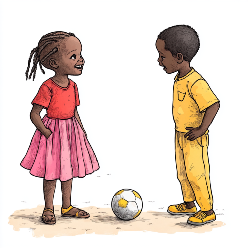 Cartoon of South Sudan 4 years old girl with very short hair plaited in thins lines, and a boy standing, ball on the ground, both smiling, side picture, red blouse, pink skirt, yellow shoes, cartoon style for illustration, white background