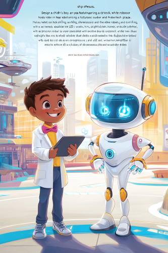 " ship of theseus, Design a children's book cover featuring a 12-year-old boy and a friendly white robot in a futuristic outdoor tech plaza. The boy holds a tablet, smiling, and the robot stands next to him, slightly shorter, with expressive blue LED eyes and a glowing smile. The robot has a transparent dome head, colorful wires visible inside, and wears a white lab coat with a red bow tie and yellow utility belt. The scene is bright and playful, with futuristic gadgets like a hovering drone car and floating devices around them. Keep the background simple but detailed, with modern city buildings in the distance. Ensure the top third of the image has a solid vibrant blue (#87CEEB) transitioning into a light fade toward the characters to leave space for the title, "AI Cool." Use inviting, happy colors like bright yellow (#FFD700), sky blue (#87CEFA), and pastel green to create a friendly and engaging vibe for kids aged 9-12. Make the design playful, with a 2D, cartoon-like illustration style." --ar 2:3 --style raw --stylize 50 --v 6.1