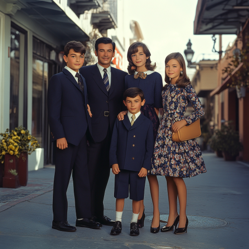 a family portrait in the streets of old town Pasadena, 60s clothing, navy blue color pallette, Dad, Mom, 13 year old boy, 12 year old girl, fashion photography, style of William Klein