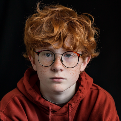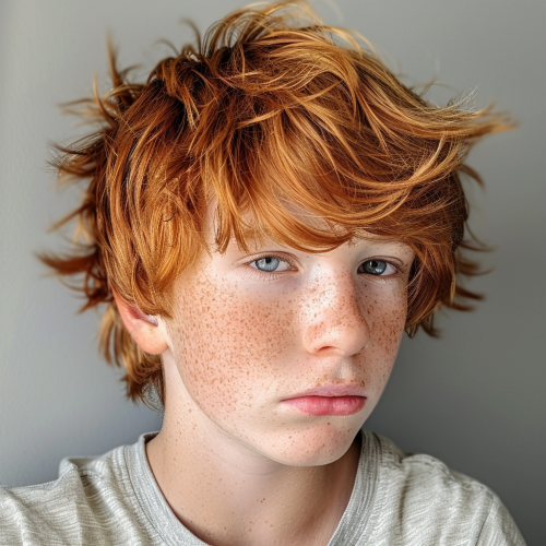 an autistic 13 year old boy with shaggy straight red hair who is very pale