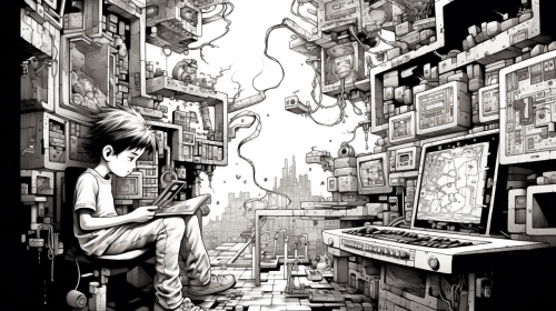13 year old boy playing tetris on a nes high detail black and white ink,comic strip with dramatic --ar 16:9