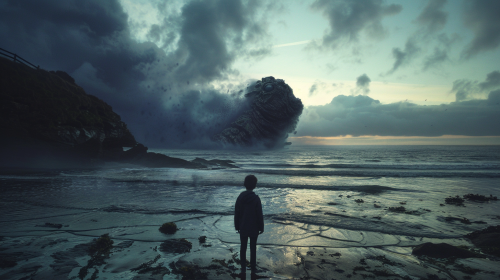a cinematic drone shot from a 2024 horror film, at dawn, from the point-of-view of a 60-foot-tall anthropomorphic sea monster, of a 17-year-old boy standing on a beach on a british isle, staring up in wonder, in the style of the film hereditary by ari aster --ar 16:9