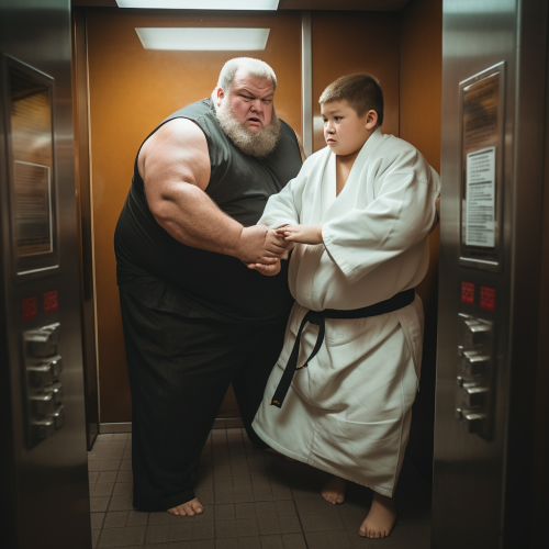 big and fat karate master training a 13 year old boy in karate inside an elevator