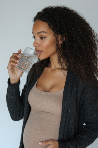 natural mixed race woman, 30 year old doing a photoshoot, 16 weeks pregnant, casual, standing, various pose, clean background, full body shot, doing a drink campaign for a refreshing water from a glass taking a sip of the drink --ar 2:3 --style raw --v 6.1