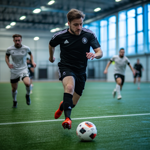 a real match of indoor with mens of 30 years. there are 2 teams (one in black jersey and the other in white). The ground is a synthethic grass . there are at least 5 fplayers on the pictures. the people are fit,