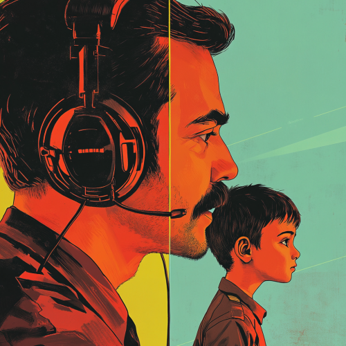 design a book cover with the page divided into two halfs. In the first half of the book cover, a side face of air traffic controller who is 30 year old indian with moustache wearing command line headset. In second half of book cover, side face of small guy of 10 years old can be seen.