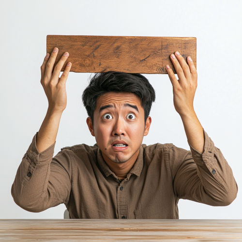 a hong kong style silm asian 30 years old man wearing a shirt, two hands holding a wood board on his head, showing the anxious facial expression, white background