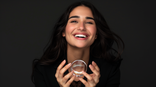 A 30 years old elegant smily woman visible teeth showing us a halfcircle device with a diameter of 20 centimeters, formal dressed, holds it in both of her hands, epic mood, view on half of the body, dark hair, empty black backround --ar 16:9 --v 6.0 --style raw