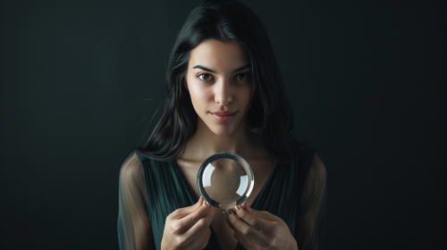 A 30 years old elegant smily woman showing us a halfcircle device with a diameter of 20 centimeters, holds it in both of her hands, epic mood, view on half of the body, dark hair, empty black backround --ar 16:9 --v 6.0 --style raw