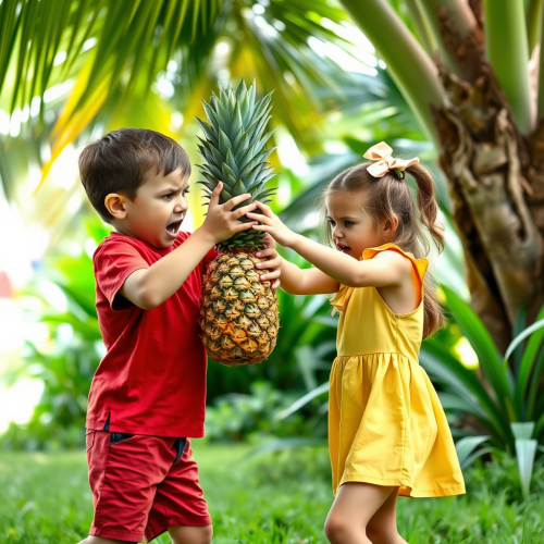 Cartoon of South Sudan 4 years old girl with very short hair plaited in thins lines, and a boy standing, ball on the ground, both smiling, side picture, red blouse, pink skirt, yellow shoes, cartoon style for illustration, white background