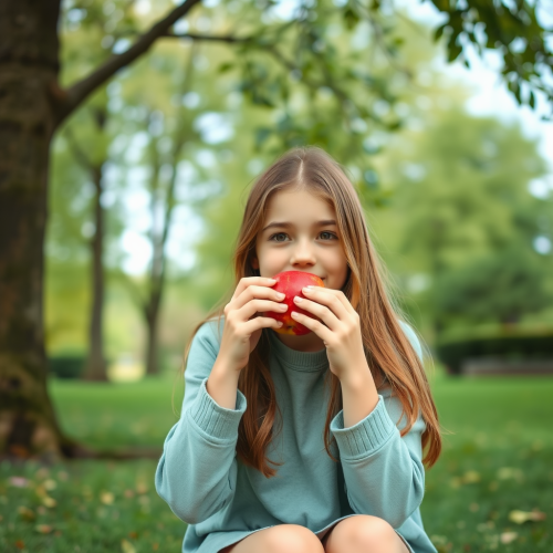 side shot, one casual smiling girls eating oval shaped friands with rounded edge.. in nature, bright day, sharpen image, martin parr style, pink details