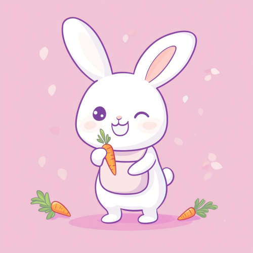 Cute, cartoon flat illustration, full body, cute bunny with bib, holding a carrot in hand, with a few carrots scattered around, on a pink background, using a flat illustration style with simple lines. This work uses vector graphics and simple design, with a minimalist cartoon style aesthetic.
