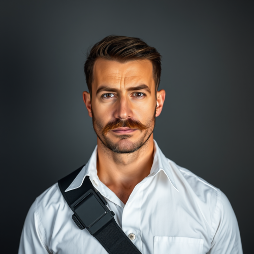 a vectorial person that has a blonde hair dyed with a moustache, chinese-like eyes but latino, and dressed with oversized clothes mostly black and with something that is related to a graphic designer, bigger nose, cross earrings, smiling