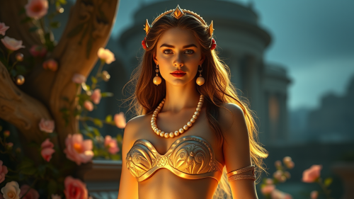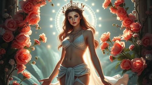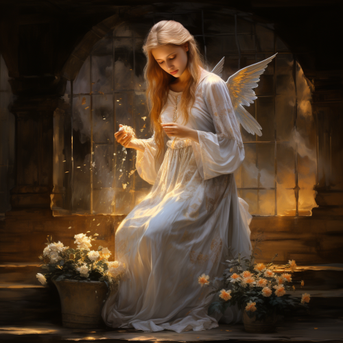 An angel's visit to Mary at a well, Mary in simple, traditional old-dress, the rustic-old well surrounded by blooming flowers, a sense of divine intervention and peacefulness, with the angel's glow illuminating, Illustration, digital art, --ar 1:1 --s 250