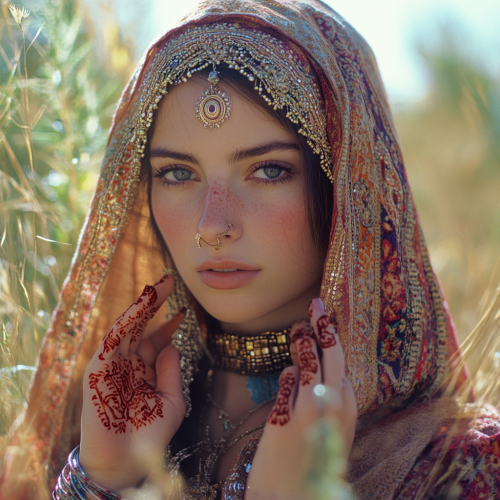 historically accurate mary of nazareth, beautiful brown golem skin, fingertips dyed red with henna, tribal dress, hair wrap, lots of jewelry including a large nose ring, include elements of nature and herbs in the background, shining halo behind her, young woman maybe 20 years old, kind eyes, color film photography, kodak vista vision 500T color negative, vibrant colors, large format film photography