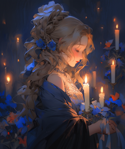 an anime girl in blue, with a candle and flowers, in the style of goblincore, simple, colorful illustrations, helga ancher, rtx on, eve ventrue, tangled forms, mary beale --ar 43:51 --niji 5