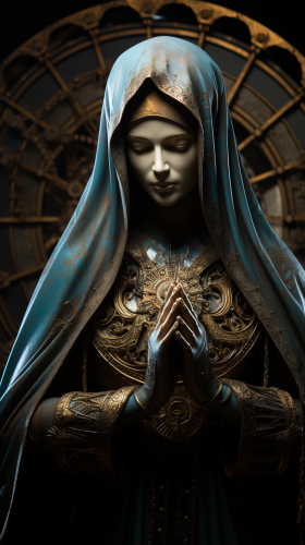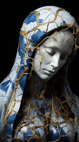Beautiful Broken Sculpture of The Blessed Mother Mary, kintsugi, traditional photographic techniques, inlay, Michelangelo Buonarroti and Antonio Canova --ar 9:16 --v 5.2 --s 250
