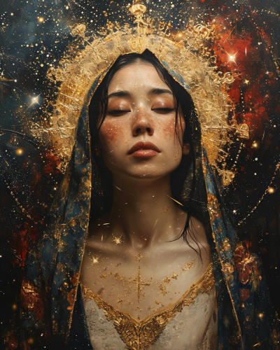 Hispanic Holy Mary the mother of Jesus with a sparkly halo surrounded by the universe, Hyperrealism, by Brooke Shaden --ar 4:5 --stylize 250 --v 6.0