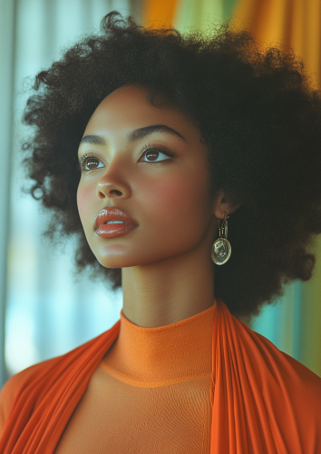 mixed race women wearing a cape and standing like a hero, 70’s aesthetic, knit body suit, Wes Anderson style photo, expired film --ar 5:7 --stylize 678