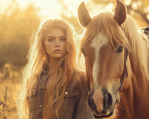 Full body portrait photo of a tough cowboy woman with long blonde hair standing beside her beautiful brown horse, classic vintage style , 1960s, photo taken at a traditional equestrian ranch, sunlight is almost blinding, editorial photography, emotional art, shapes are fluid and undefined, high definition digital art, negative color, a mix of pastel colors and neon, a poetic and creative perspective, inspired by Man Ray's visionary photography, large-screen camera, photo art that is also inspired by digital art, cold color scale with hints of flickering neon, --ar 5:4 --p 6s1y8tz