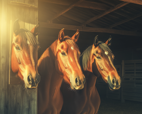 Full body portrait photo of three beautiful brown horses in a barn, classic vintage style , 1960s, photo taken at a traditional equestrian ranch, sunlight is almost blinding, editorial photography, emotional art, shapes are fluid and undefined, high definition digital art, negative color, a mix of pastel colors and neon, a poetic and creative perspective, inspired by Man Ray's visionary photography, large-screen camera, photo art that is also inspired by digital art, cold color scale with hints of flickering neon, --ar 5:4 --p 6s1y8tz